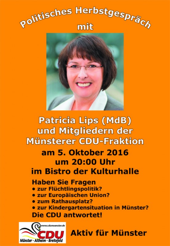 Patricia Lips ist seit vielen Jahren Mitglied des Deutschen Bundestages. Nach einem aktuellen, politischen Bericht aus der Bundeshauptstadt Berlin stellt sie sich beim Münsterer Herbstgespräch den Fragen der Besucher. Sicher werden dann Themen, wie der Brexit oder die Flüchtlingspolitik angesprochen. Aber auch zu anderen aktuellen Fragen wird die Bundespolitikerin an diesem Abend Rede und Antwort stehen.